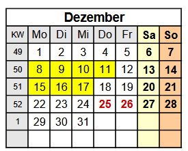 März: 25.03/26.03 April: 22.04/23.04 Mai: 20.05/26.05 Juni: 17.06/18.06 Juli: 01.07/02.07 September: 23.09/24.09